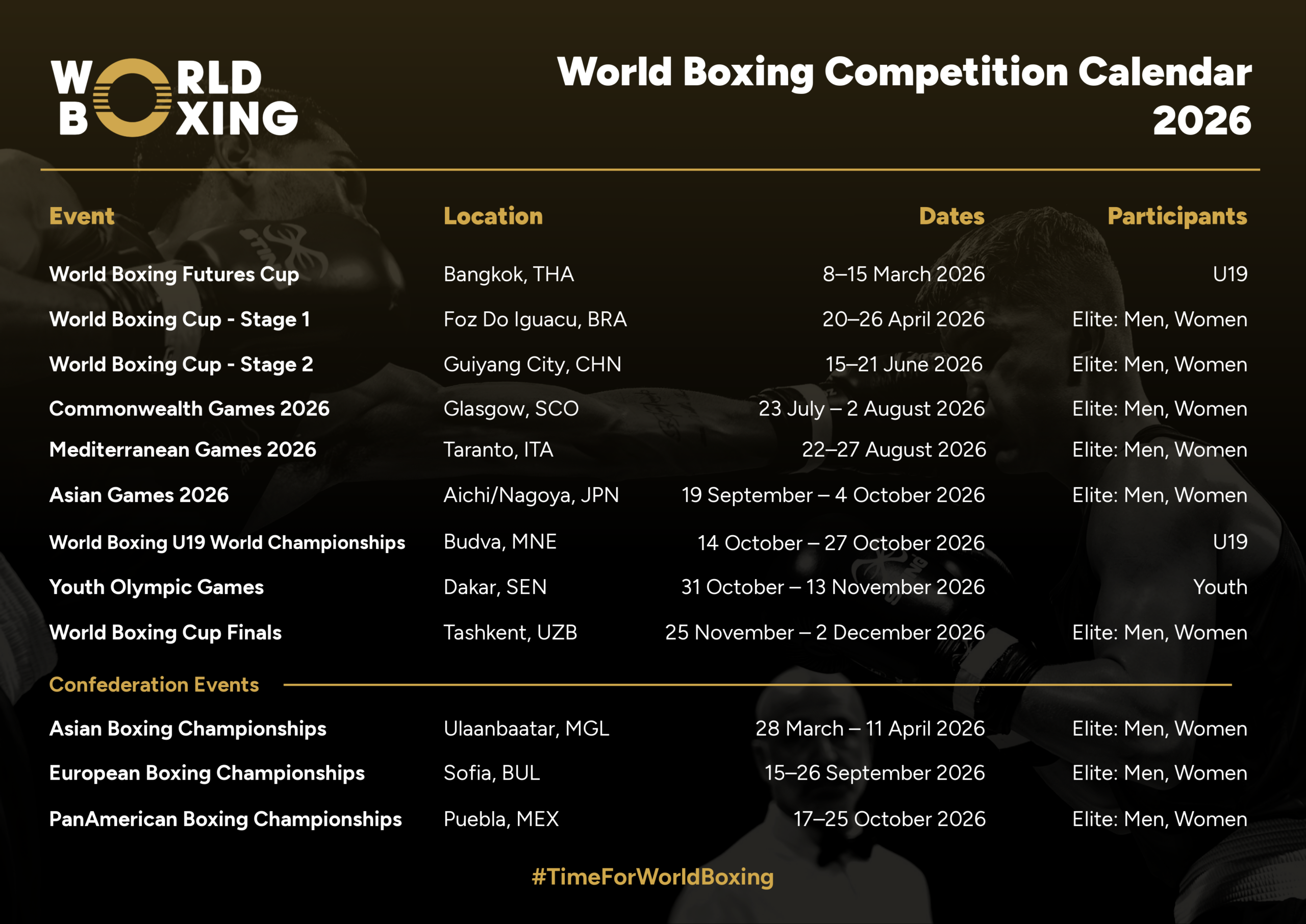 All of World Boxing’s member National Federations are welcome to bid to host events, and decisions on the timing and location of these are subject to clear procedures that are designed to provide certainty to boxers, coaches and National Federations and enable them to plan and prepare for tournaments with the confidence that they will happen at the time and location when they are scheduled to take place. Timelines and processes for bidding for events are transparent with fixed deadlines and decisions on hosting and timing are made in the interests of boxers. Once events have been allocated and dates confirmed, World Boxing has processes in-place to ensure that these cannot be amended.
